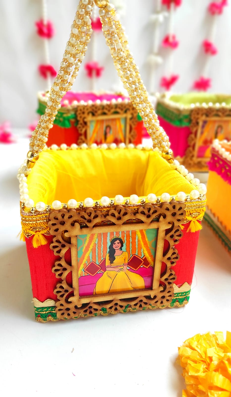 Step into the world of elegance and tradition with our exquisite Haldi Favour Basket, designed to add a touch of sophistication to your special occasion. Whether you’re celebrating a wedding, engagement, or any other festivity, these beautifully crafted baskets are the perfect way to express gratitude to your guests.